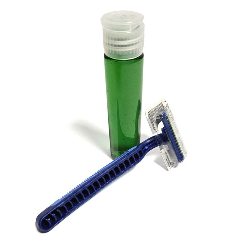 Kit de afeitar máquina gillette y botella 35 cc tapa flip top con gel de afeitar en bolsa con cierre adhesivo.